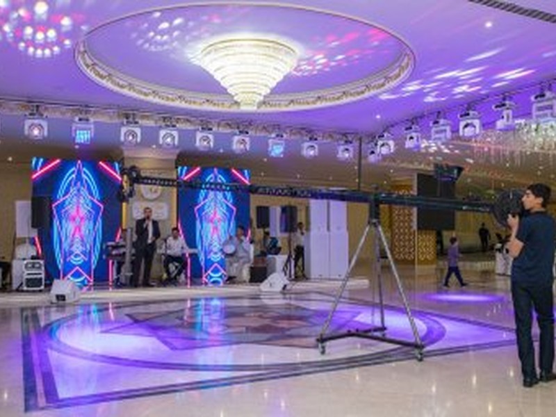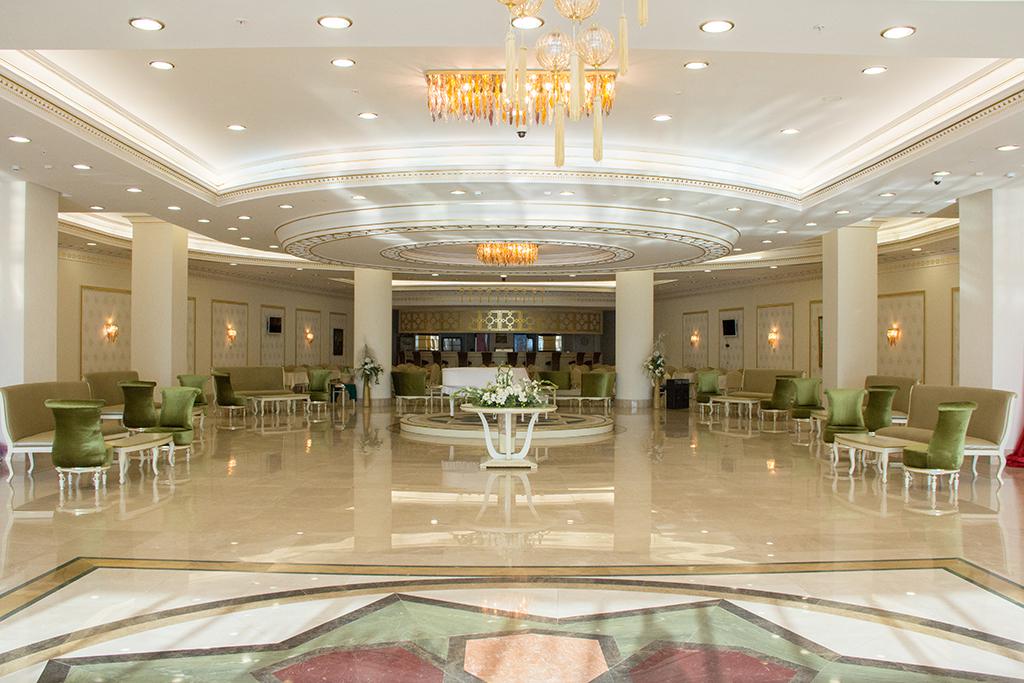 Свадебные залы расположены на 1-ом этаже Центра. В них созданы условия для проведения с широким размахом благородных традиций нашего народа как: садака, рождение ребенка, вручение подарков, свадеб и других торжественных празднеств